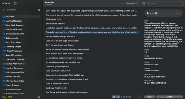 No clutter, just what you need to get the job done. Whether you're prototyping dialogue, generating narration, or experimenting with tone, TinyTTS lets you work quickly and stay in flow. Export audio in seconds, organize clips by folders, and focus on creativity—not technical setup.